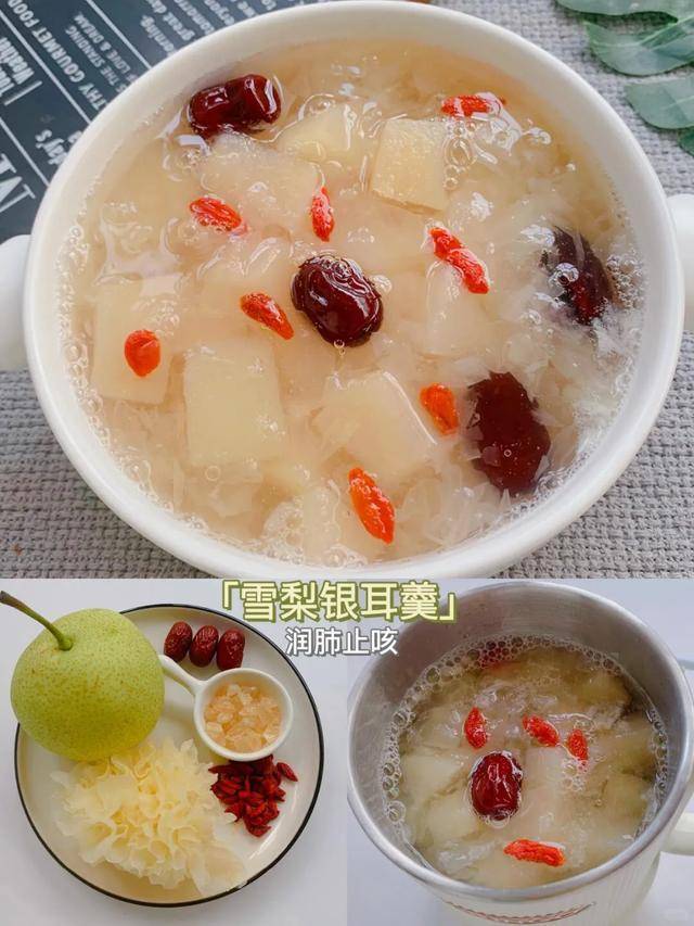 做法:银耳、雪梨、百合、红枣一起放入养生壶煮20分钟;出胶后加冰糖再煮5分钟;出锅前撒入枸杞即可。
