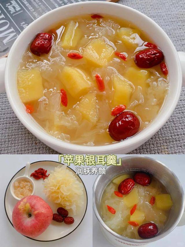 做法:银耳、苹果、红枣一起放入养生壶煮20分钟;出胶后加入冰糖再煮5分钟;出锅前放入枸杞即可。