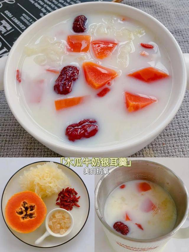 做法:银耳、木瓜、红枣一起放入养生壶煮20分钟;出胶后加入冰糖煮5分钟;出锅前放入枸杞,倒入牛奶煮开即可。