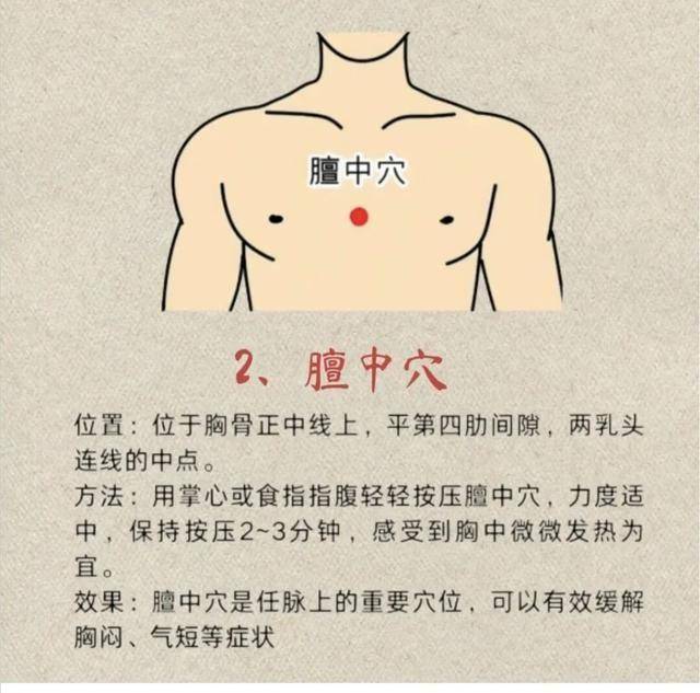 - 膻中穴(胸部,前正中线,两乳头连线的中点处)能“宽胸理气、缓解胸闷”,是调理胸气的“核心穴位”,和神藏穴搭配,能从胸中央到两侧双重疏通胸肺气机、改善呼吸。胸闷气喘时,轻按神藏穴8分钟、膻中穴5分钟(力度轻柔),配合缓慢扩胸运动,每天2次,10分钟内就能感觉胸口放松,气喘缓解。