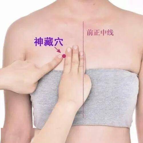 简单总结:乳头直上2个肋间隙(第2肋间隙),前正中线旁开3指宽,按之酸胀即是神藏穴。如果自己找不准,也可以先定第2肋间隙,再向乳头外侧3指处轻按,有酸胀感且能缓解胸肺不适的地方就是,不用精确测量,以“酸胀感+缓解不适”为判断标准更简单。
