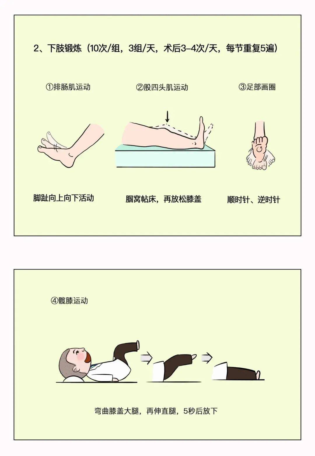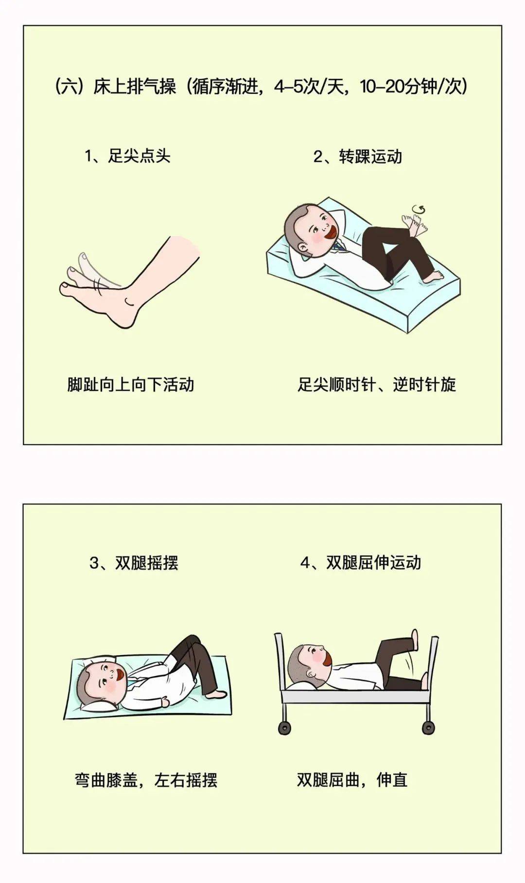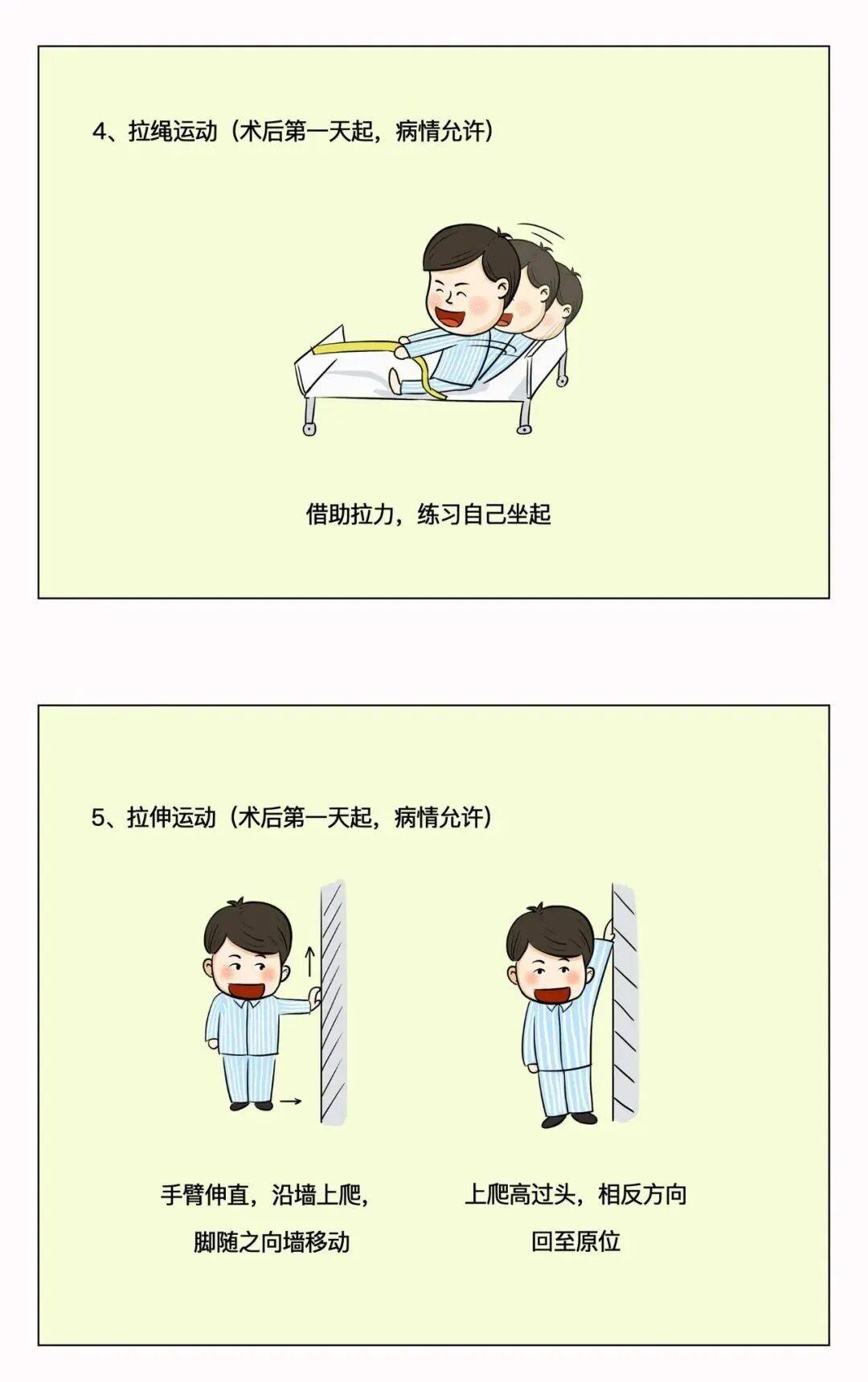 手术后的早期活动可预防坠积性肺炎和下肢静脉血栓的形成,手术麻醉效果退去之后,就可以开始协助患者活动了。一般术后第一天,在生命体征平稳状况下,即可鼓励患者床上活动四肢。2-3天患者可以坐在床边,身体条件允许情况下,在床边站立或者走动。