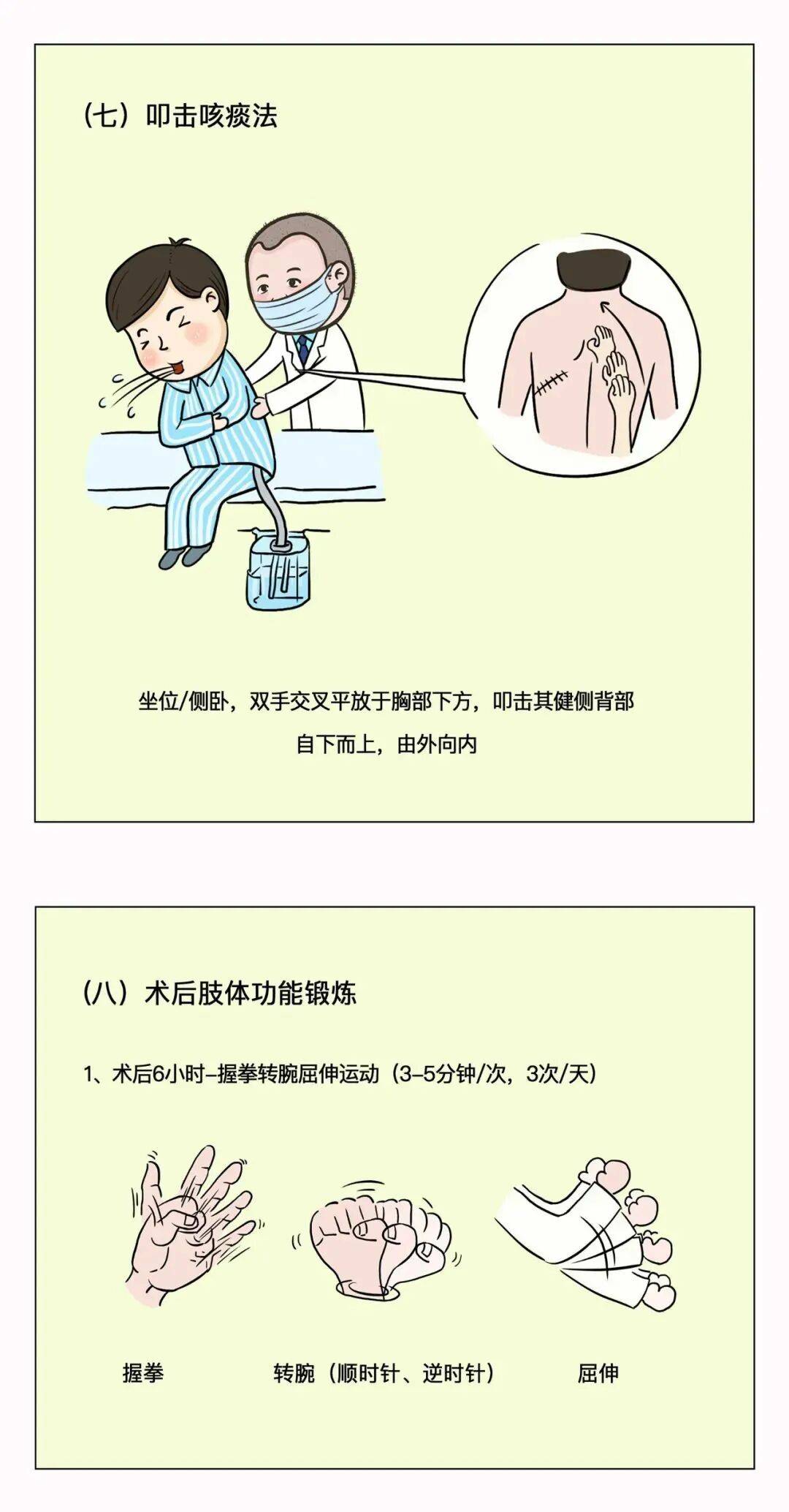 怎么操作呢?如漫画中第七步,叩击咳痰法所示:让患者坐着,操作者站在床边,手掌呈杯状,叩打与有痰部位相应的胸壁,并同时鼓励患者咳嗽,并用双手掌按压手术那侧的胸廓,吸气时双手放松,咳嗽时双手加压,以保护伤口,减少胸壁震动引起的切口疼痛。