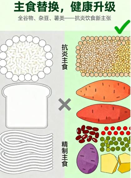 最近有项新研究给出了一个简单又实用的抗炎方法:不用大幅度调整整体饮食习惯,只要把平时吃的精米白面,换成全谷物当主食,坚持 6 周,就能明显降低全身的炎症水平。