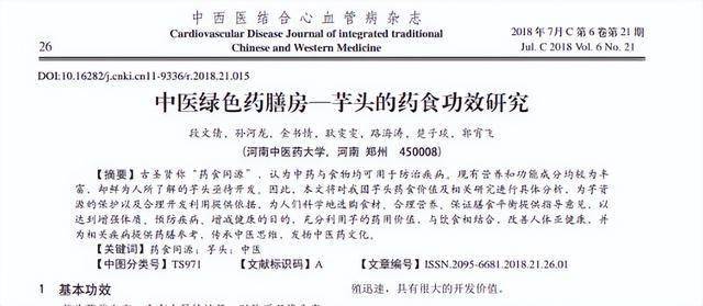 [1]段文倩,孙河龙,金书情,等.中医绿色药膳房—芋头的药食功效研究[J].中西医结合心血管病电子杂志,2018,6(21):26