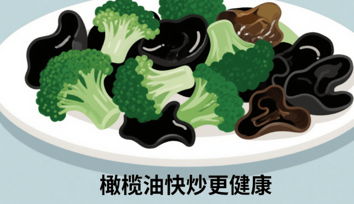 西兰花里头含有抗癌的东西,木耳能帮忙清理肠道,先把木耳泡开,西兰花拿去焯个水,接下来用一点点橄榄油赶紧炒炒,再放一点点盐调调味就行。