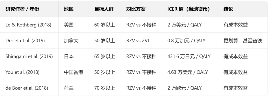 比如美国的一项研究显示,70 岁人群接种 RZV,ICER 仅为 2 万美元 / QALY,远低于 10 万美元的阈值;加拿大的研究则发现,75 岁人群接种 RZV,甚至能 “省钱”—— 因为减少了后续治疗 PHN 的费用,总支出反而比不接种更低。