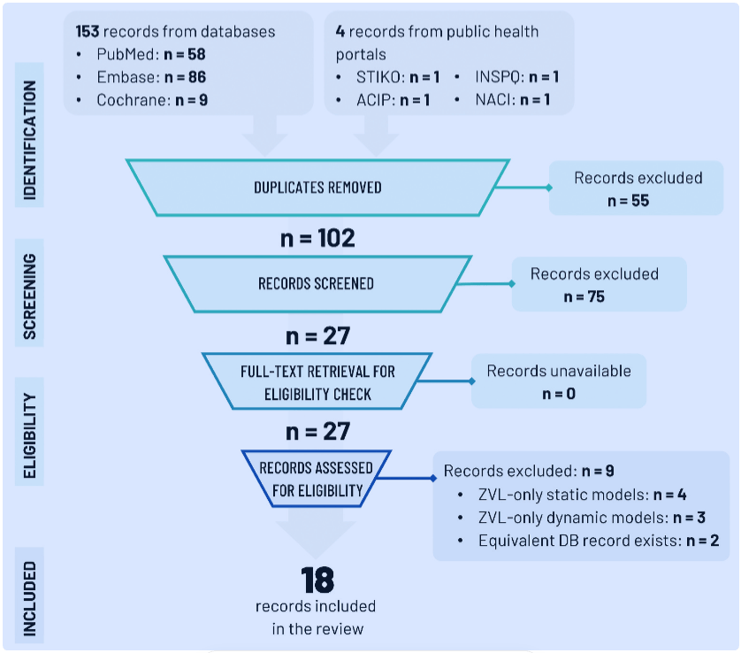 首先在 PubMed、Embase、Cochrane 三大数据库搜索,还手动查阅了美国 CDC、加拿大国家免疫咨询委员会等官方机构的网站,排除了只讲疾病成本、不涉及疫苗对比的研究,也排除了会议摘要,最后通过 “标题筛选→全文审核→参考文献追溯” 三步,确定了 18 项核心研究。具体筛选流程可以看下面的流程图: