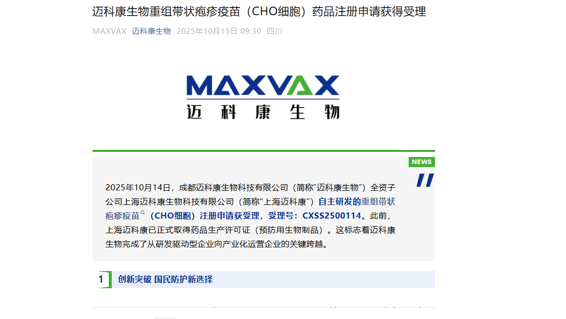 “迈科康生物”官网10月15日发布,10月14日成都迈科康生物科技有限公司全资子公司上海迈科康生物科技有限公司自主研发的重组带状疱疹疫苗(CHO细胞)注册申请获受理,受理号:CXSS2500114。此前,上海迈科康已正式取得药品生产许可证(预防用生物制品)。这标志着迈科康生物完成了从研发驱动型企业向产业化运营企业的关键跨越。