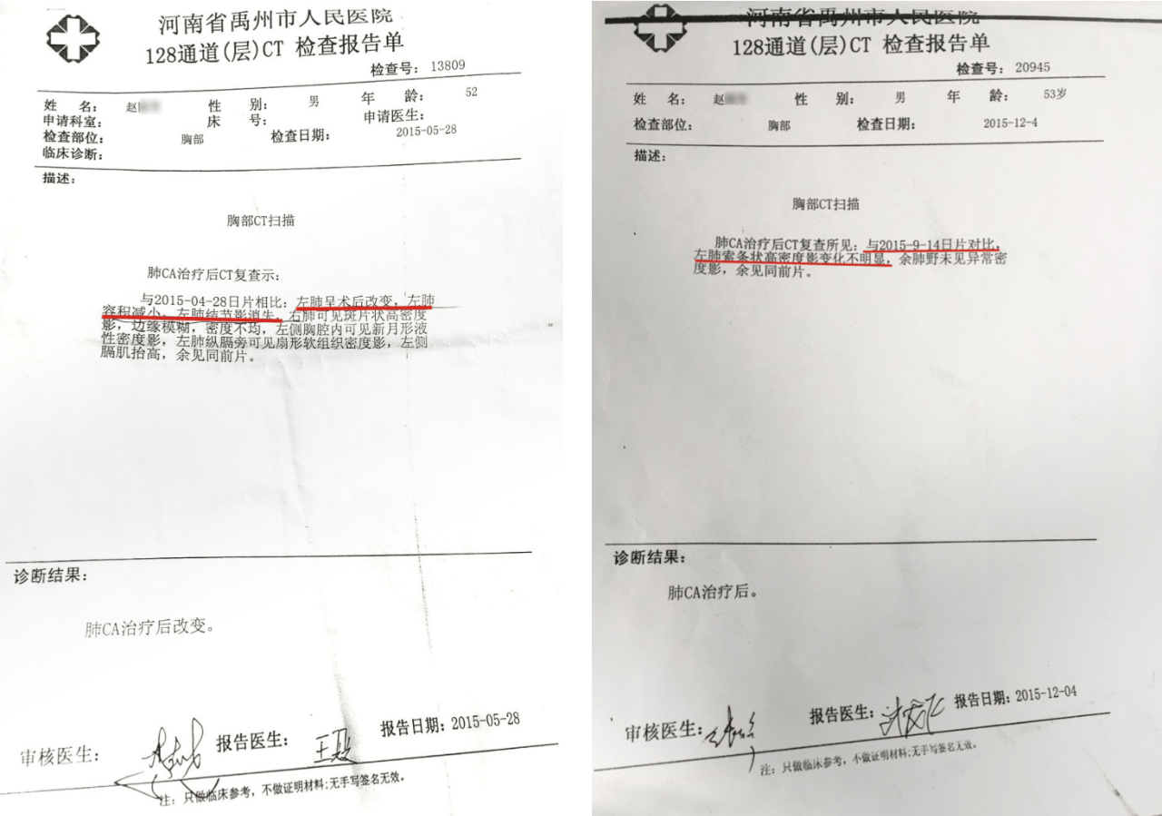 2015年2月,赵国芳师傅突然觉得胸口一阵阵疼。一开始以为是累的,去诊所看了看,没见好,咳嗽还越来越重。拖到4月份,他去禹州市人民医院做了详细检查,结果让人心头一沉:肺叶上长了个2厘米左右的肿物,后来确诊为“肺低分化腺癌”。