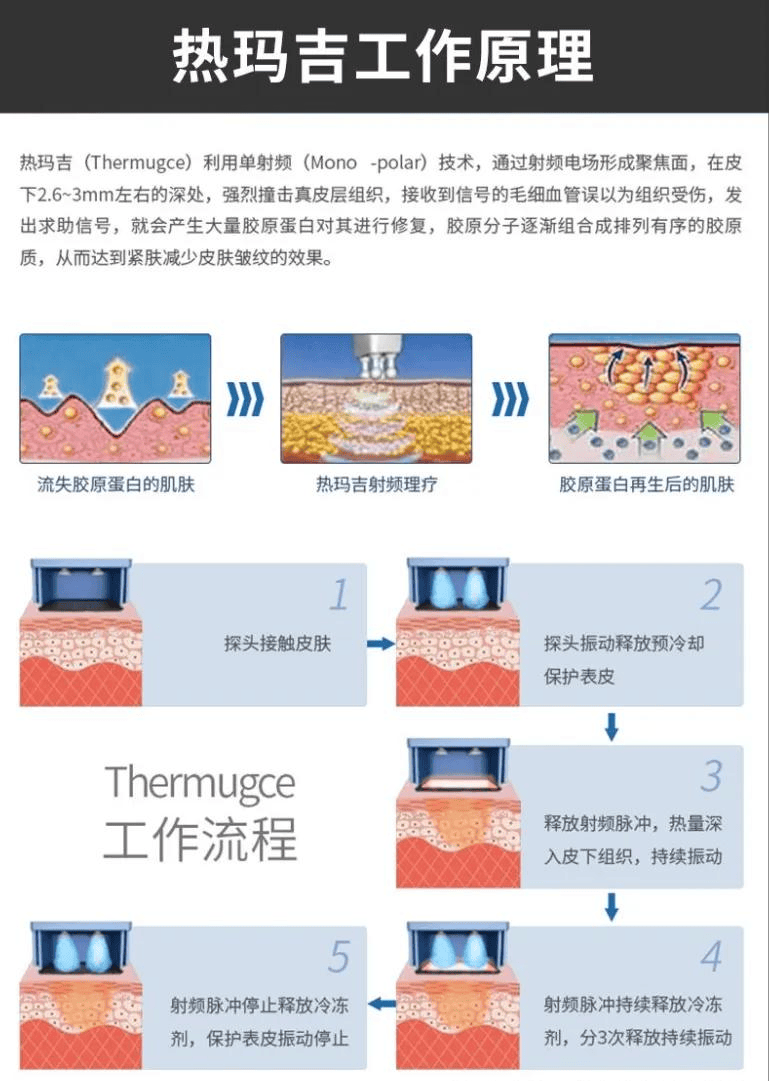 热玛吉运用先进射频技术,这是其发挥美容功效的核心。设备启动后产生高频变化的电磁波,因人体是电流优良导体,射频电流作用于人体时,细胞内水分子在电磁波作用下高频振动和旋转,产生大量热能。