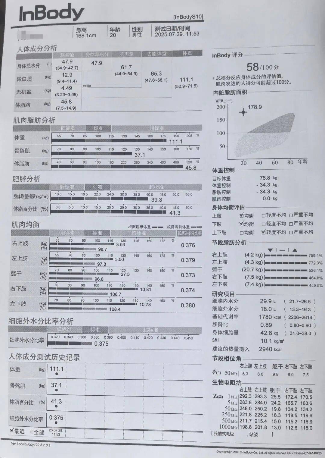 经过专业人体成分分析检测: 体脂比严重超标,内脏脂肪面积严重超标,基础代谢率下降。
