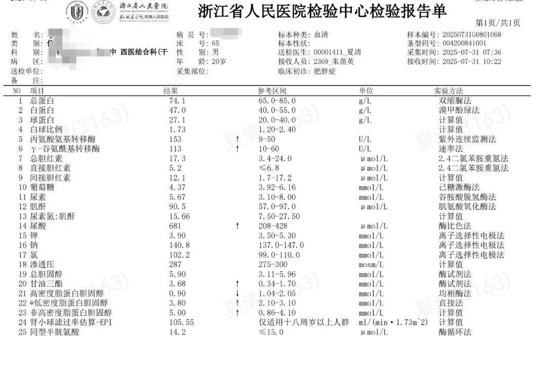 今年暑假,身高160cm,体重高达220斤的小王同学在家人的陪同下来到望江山院区中西医结合科门诊就诊。检查结果显示,这位刚刚成年的年轻人已经出现了严重的健康问题:血糖偏高,高血压、高血脂、高尿酸、脂肪肝并伴有肝功能异常。