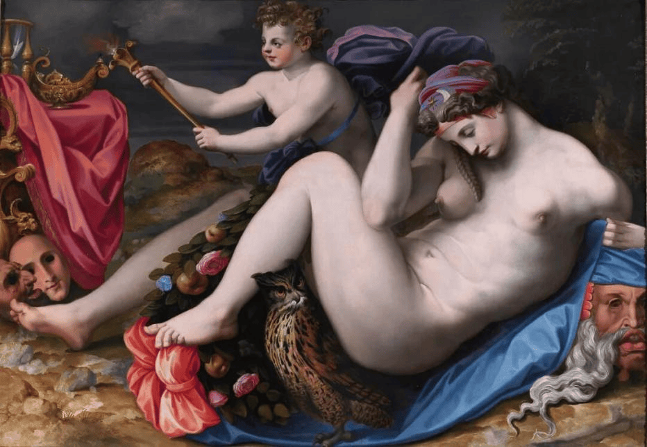 《夜晚》,米歇尔·托西尼 (1555-1565),现藏罗马科隆纳宫美术馆,画中女性左乳房呈现乳头完全内陷、乳晕周围皮肤凹陷及乳房整体萎缩的特征,被视为文艺复兴时期最早的乳腺癌影像证据之一。其朦胧的暗色调隐喻了患者置身于治疗手段匮乏的“长夜”。图片来源:Wikimedia Commons
