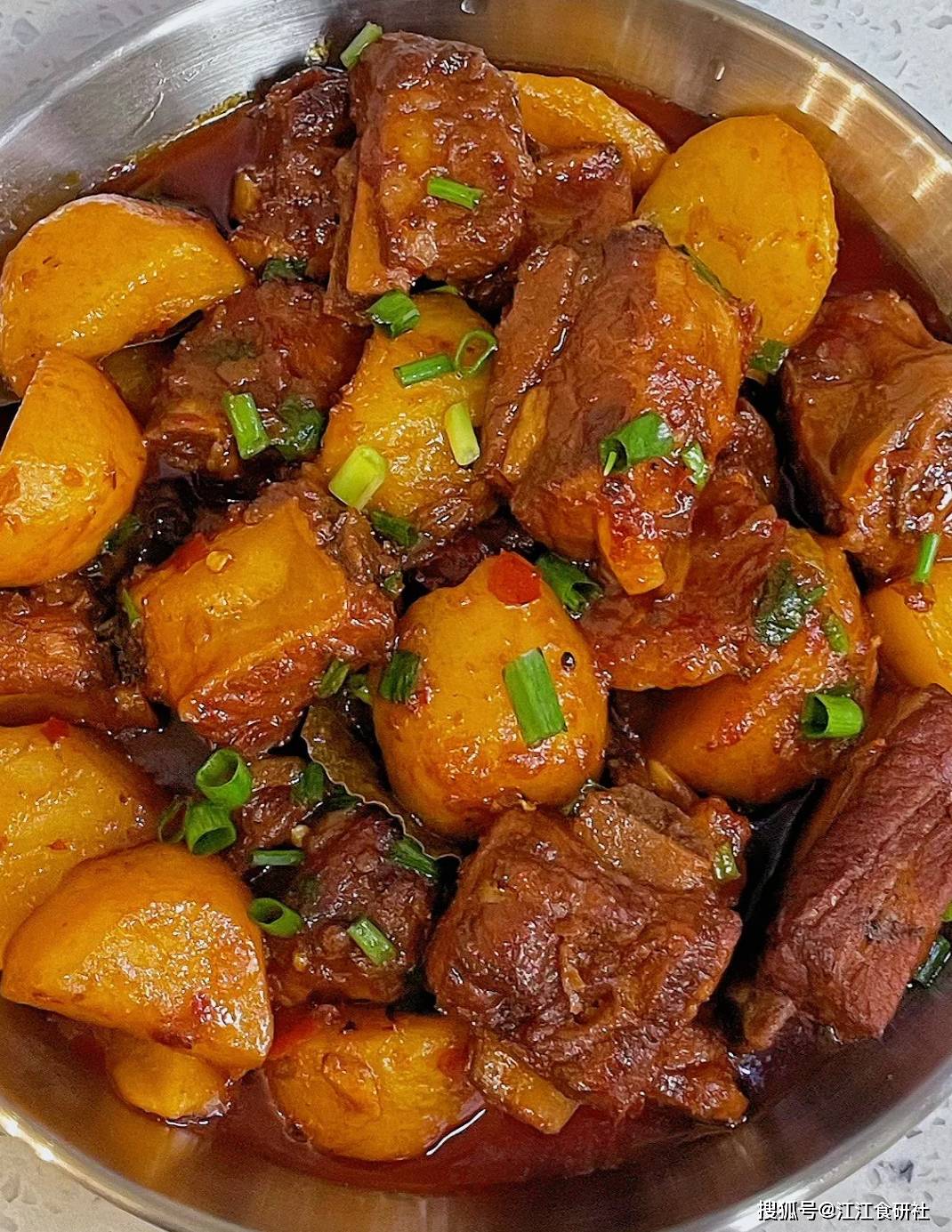 最后大火收汁,看到汤汁浓稠地裹在排骨和土豆上,撒上葱花就可以了。