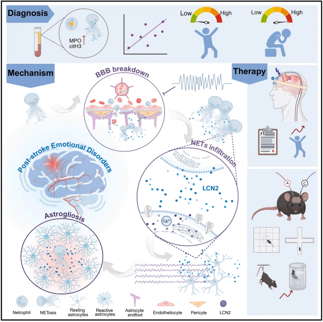 该研究揭示了外周免疫系统与中枢神经系统之间的跨血脑屏障的交互机制,确定了中性粒细胞外诱捕网 (NET)释放的脂质运载蛋白-2(Lcn2)在卒中后情绪障碍(PSED)发病中的关键作用,而经颅直流电刺激(tDCS)通过抑制 Lcn2 的释放来缓解 PSED。