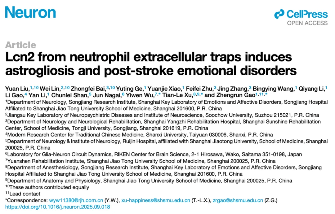 2025 年 10 月,上海交通大学医学院松江研究院 高郑润、上海交通大学医学院 徐天乐、 上海交通大学医学院附属瑞金医院 吴逸雯等人,在 Cell 子刊 Neuron上发表了题为: Lcn2 from neutrophil extracellular traps induces astrogliosis and post-stroke emotional disorders 的研究论文。