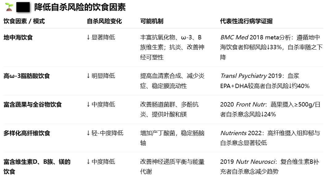事实上,流行病学证据不仅发现【破坏菌群的“高糖 + 高脂 + 高加工”饮食 → 神经炎症、肠道菌群紊乱、神经递质合成障碍 → 抑郁、冲动、自杀风险上升。】,也发现【促进菌群健康的“低加工+高纤维+高ω-3”饮食→ 抗炎、抗氧化、稳定肠脑轴 → 情绪稳定、自杀风险下降】。