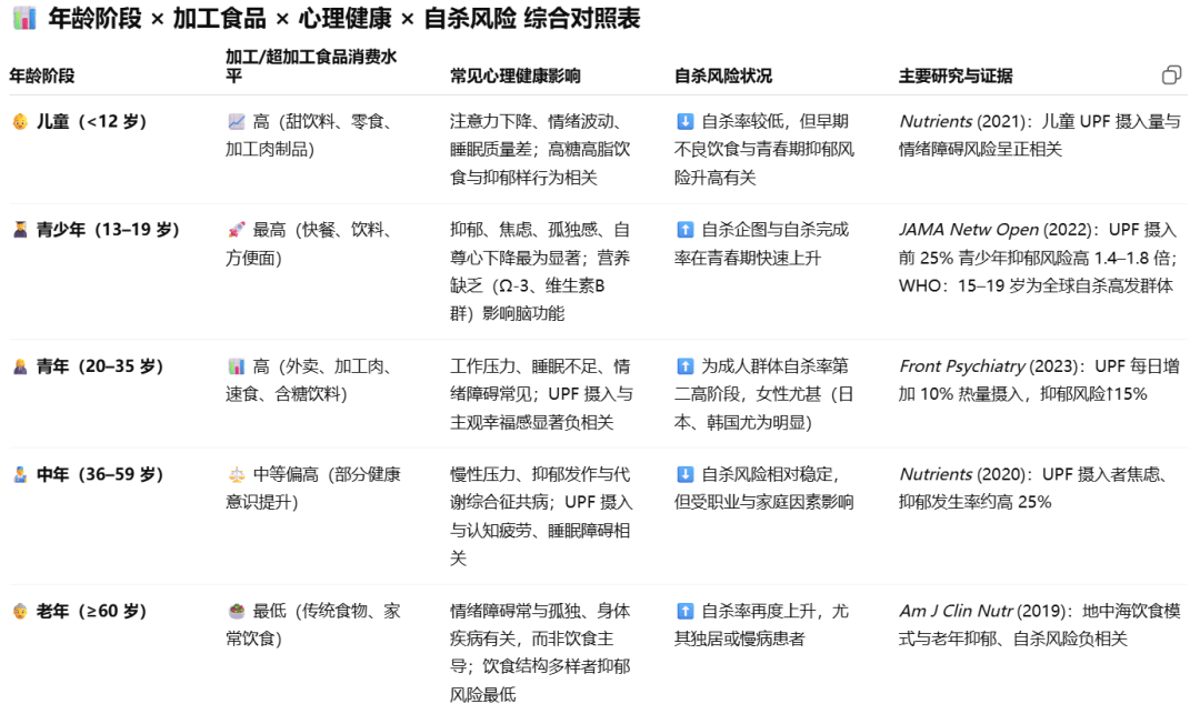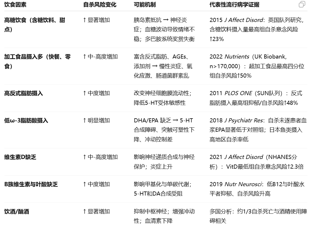 大量流行病学研究显示:高加工食品摄入 → 抑郁风险↑ → 自杀风险↑。也就是说,加工食品对自杀的影响可能是间接的、通过情绪障碍介导的。