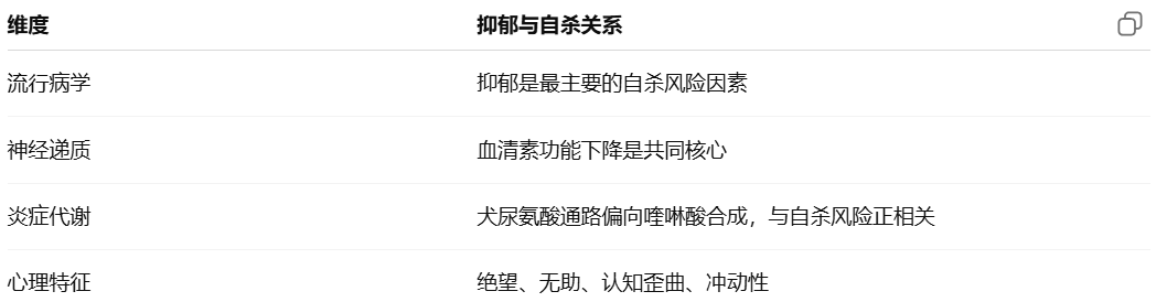 抑郁是自杀最强的单一危险因素之一,约 50–70% 的自杀者患有抑郁障碍(包括重度抑郁、双相障碍等);而在所有重度抑郁症患者中,约 15% 最终死于自杀。