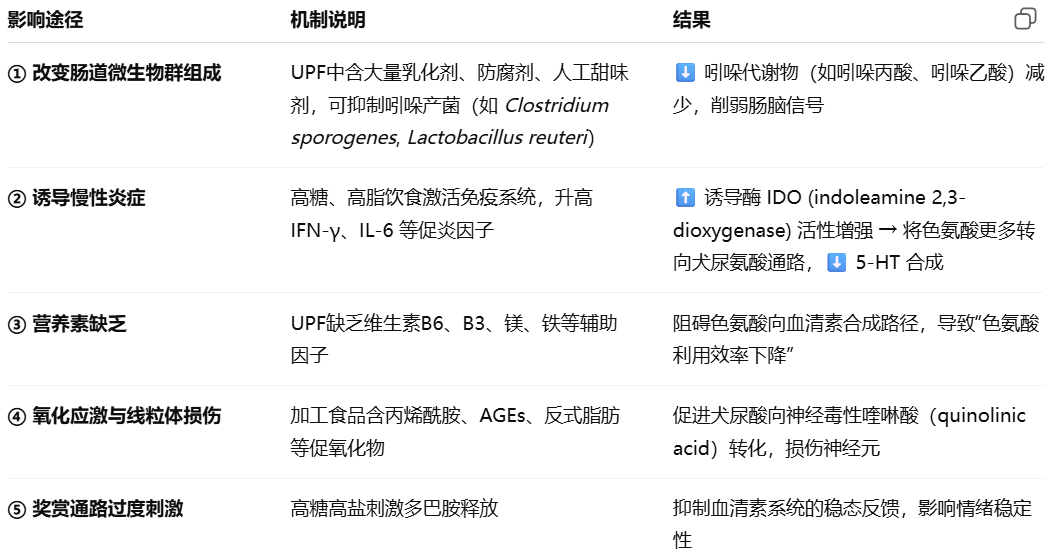 加工食品会改变人体色氨酸代谢,在甜蜜的陷阱:艾格特菌上升情绪状态下降?食与心介绍过软饮料会促进色氨酸的吲哚途径代谢;在喝这种饮料脑子居然会变差!为什么阿斯巴甜会伤脑?,食与心介绍过阿斯巴甜会通过增加苯丙氨酸抑制色氨酸进入大脑,从而阻止5-HT通路代谢;加工食品还会促进犬尿氨酸通路代谢,进一步阻止5-HT和褪黑素合成。除此之外,加工食品中缺乏的叶酸、维生素B6、B12、铁、锌、镁等微量元素也会通过影响酶活性限制5-HT通路。