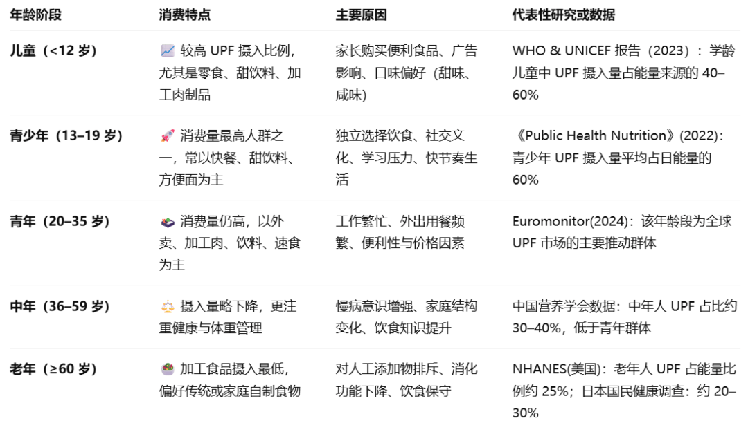 就实际情况而言:超加工食品消费在少、青年期达到顶峰,之后随年龄上升呈下降趋势。关键分界点约在 30–40 岁之间,饮食习惯开始从“方便导向”转向“理性(健康)导向”。女性平均 UPF 摄入比例略低(更重视营养),但甜品类消费较高。