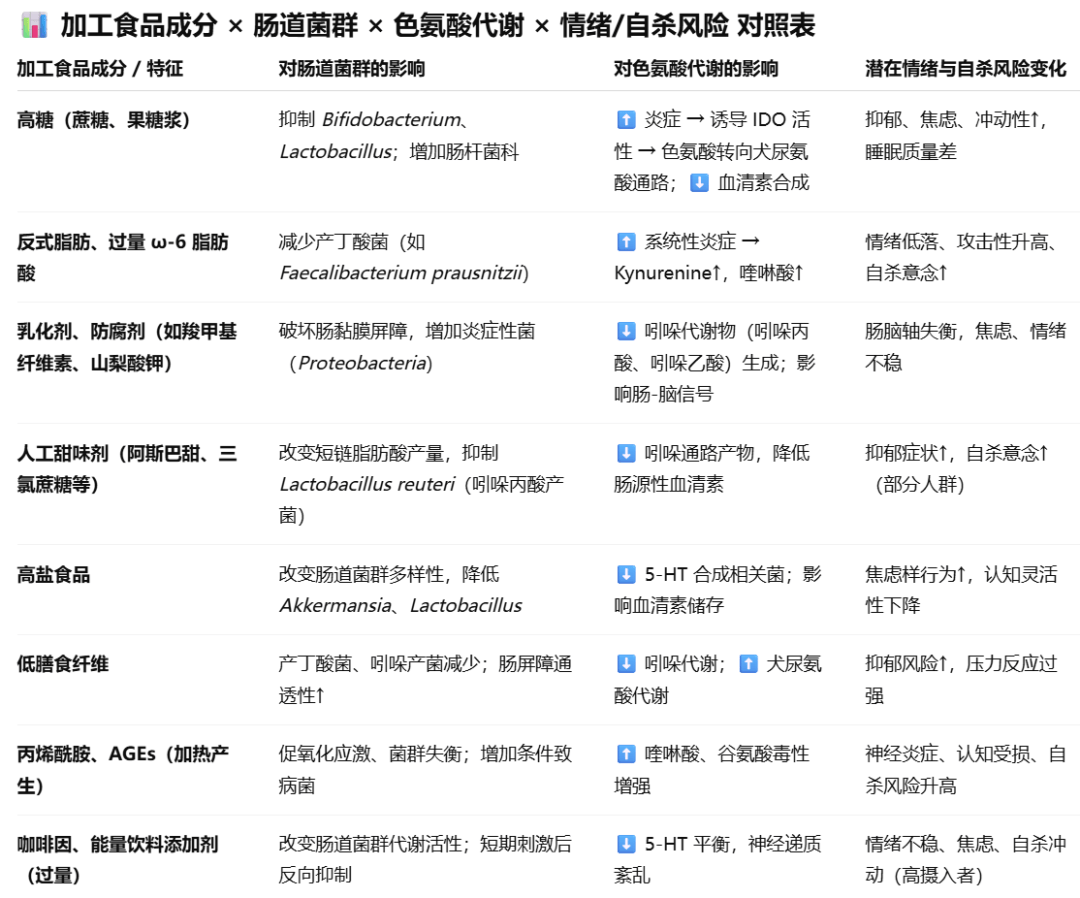 下面我们以色氨酸代谢为例,来说明加工食品是怎样改变菌群和色氨酸代谢,从而升高自杀风险的。