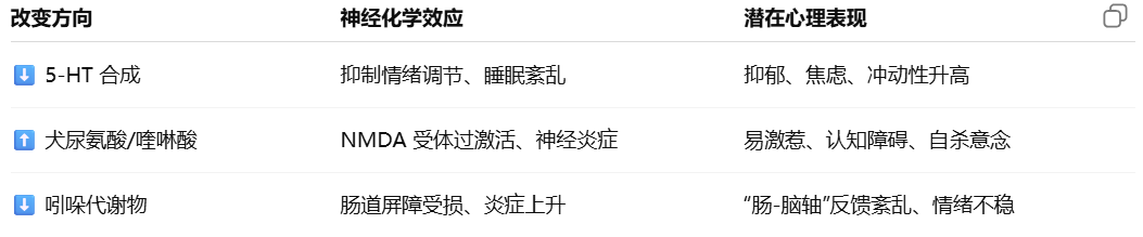 以神经递质为例,加工食品消费会通过改变肠道菌群而扰乱色氨酸代谢,促进色氨酸代谢为促炎或伤脑的物质(如喹啉酸和吲哚),而阻止色氨酸代谢为5-HT(提升快乐和幸福感)和褪黑素(促进睡眠)。
