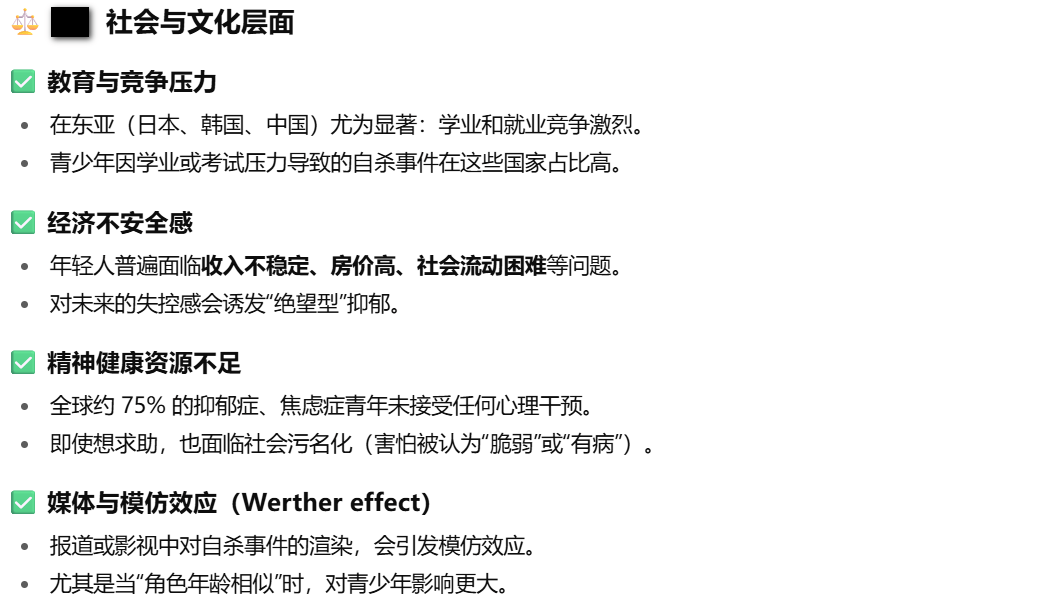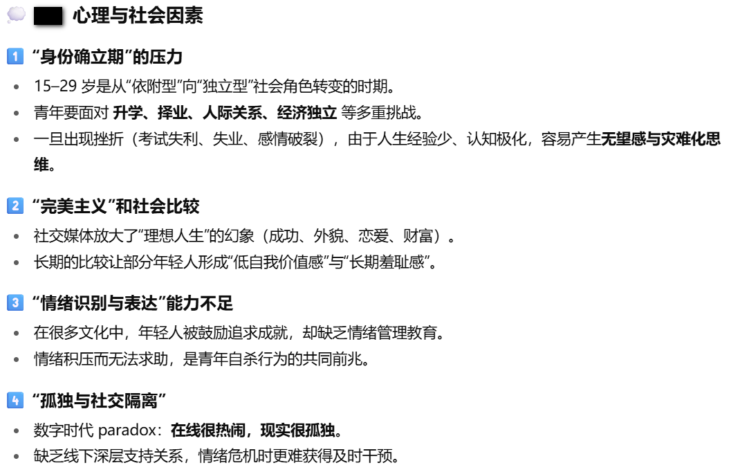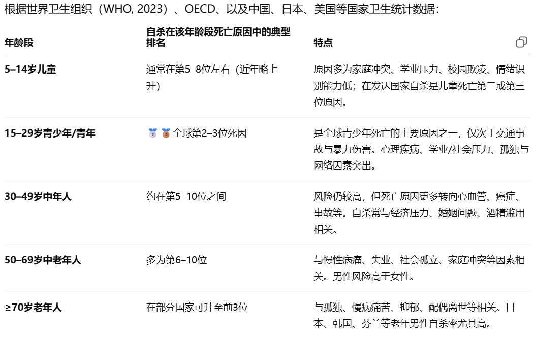 在 15–29 岁的年轻人群中,自杀是仅次于:1️⃣ 道路交通伤害2️⃣ 结核病(或孕产相关疾病,在部分地区)的 第三大死因。这个年龄段的自杀占全部自杀人数的约 1/4。