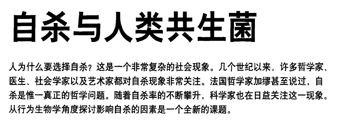当然自杀本身还有其它因素,宗教上的殉教、政治上的殉死、战争中的殉死以及情感原因上的殉死,病痛长期折磨等等。然而这些情况在人群中发生的机会已经变得越来越少,更多情况应当注目食品安全、饮食健康和肠道微生物的改善。也可以尝试通过菌群来评估抑郁症程度,从概率上推测自杀风险。