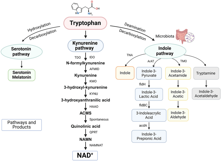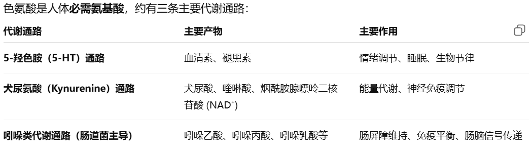 色氨酸不仅是必需基础氨基酸之一,也是幸福荷尔蒙五羟色胺(5-HT,血清素)和睡眠荷尔蒙褪黑素的合成前体。不过合成5-HT和褪黑素只是色氨酸的三条代谢通路之一。