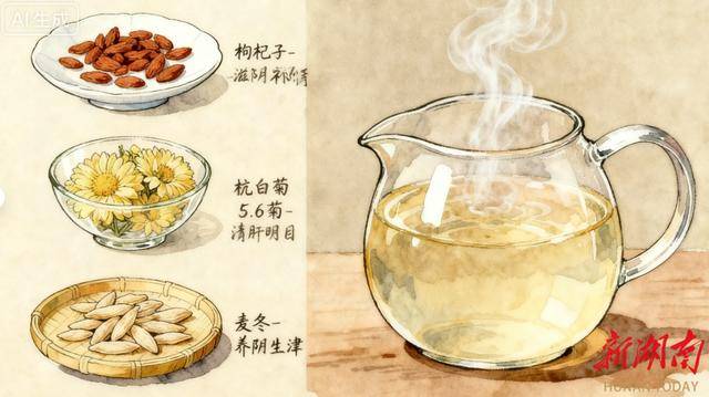 滋阴明目茶。取枸杞子10-15粒、菊花(杭白菊或胎菊为佳)5-6朵、麦冬10克。用沸水冲泡,闷泡10-15分钟后饮用,可反复冲泡,可滋补肝肾、清肝明目、滋阴润燥。