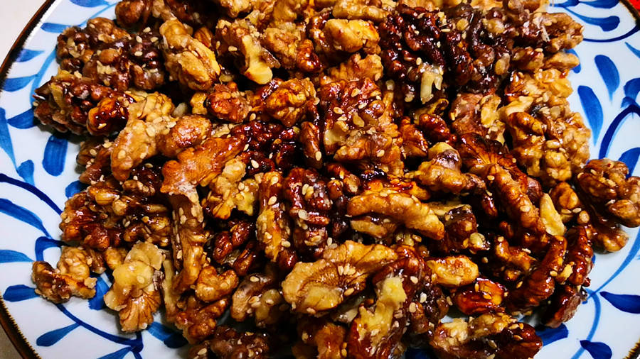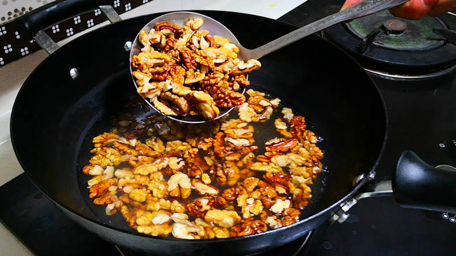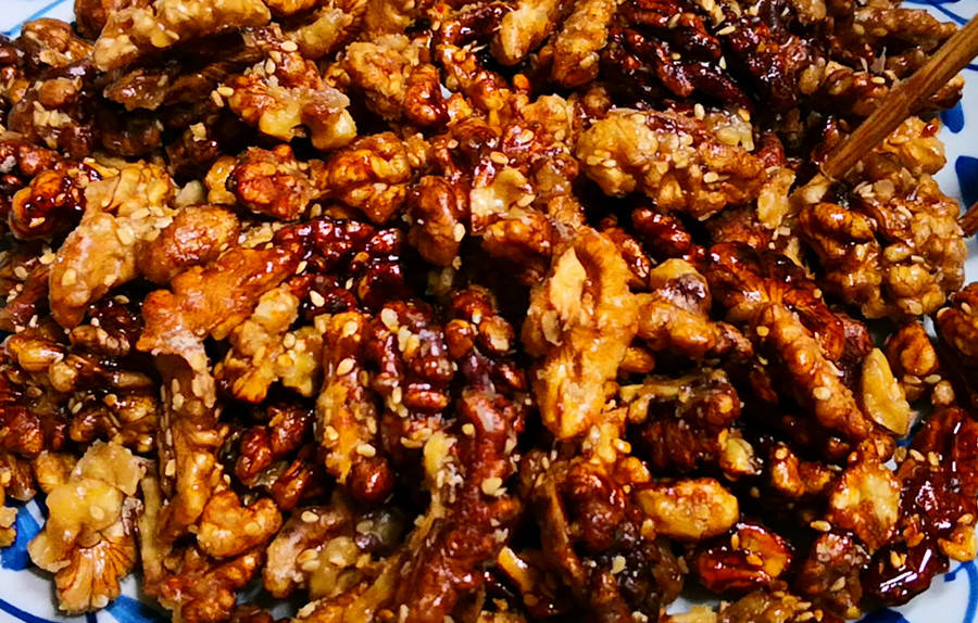 琥珀核桃做法也是十分的简单,首先准备适量的核桃仁、白糖、蜂蜜和水。将核桃放入开水中焯一下,去除表面的涩味,然后捞出沥干水分。接着,在锅中加入适量的水和白糖,小火煮至白糖融化,形成糖浆。再将核桃放入糖浆中,翻炒均匀,让每一颗核桃都裹上糖浆。最后,加入适量的蜂蜜,继续翻炒,直到糖浆变得浓稠,核桃表面形成一层晶莹的糖衣。将炒好的琥珀核桃放在盘子里晾凉,美味就大功告成啦!