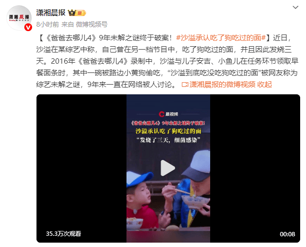 近日,沙溢在某综艺中称,自己曾在另一档节目中,吃了狗吃过的面,并且因此发烧三天。2016年《爸爸去哪儿4》录制中,沙溢与儿子安吉、小鱼儿在任务环节领取早餐面条时,其中一碗被路边小黄狗偷吃,“沙溢到底吃没吃狗吃过的面”被网友称为综艺未解之谜,9年来一直在网络被人讨论。