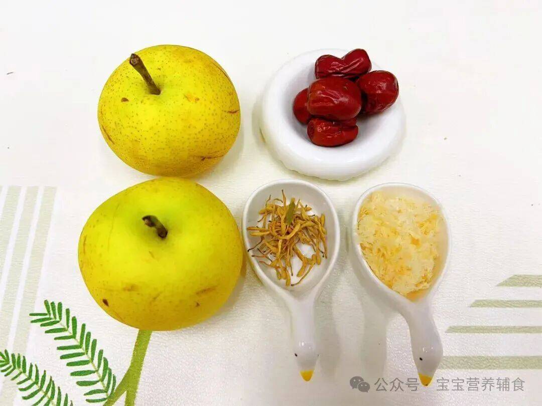 食材梨2个、金银花3克、红枣15克、冻干银耳15克