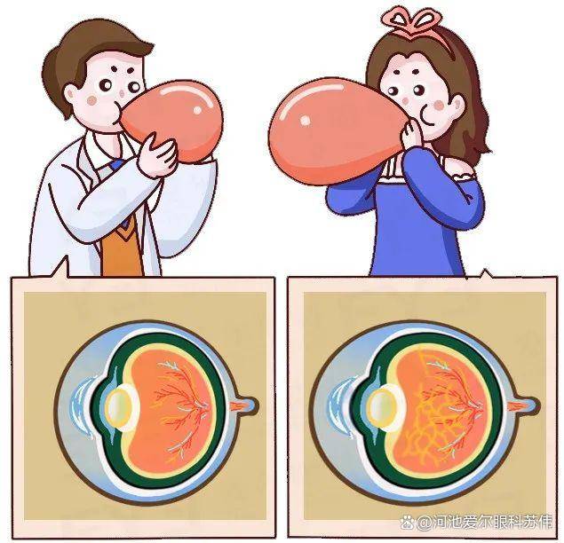 近视度数太高会有什么风险呢?其实近视度数的本质,就是眼球前后直径(也就是“眼轴”)被拉长的程度。正常的眼轴大概在24毫米,600度近视的眼轴就已经达到26毫米,这已经到了眼球的风险临界值。而2000度近视的眼轴可能会超过32毫米——这就好比一个被吹得太胀的气球,球壁(也就是我们的视网膜)会被拉得越来越薄,随时可能出现“裂纹”。