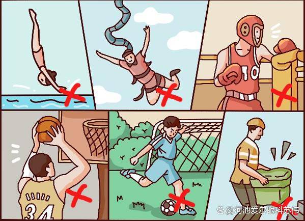 另外,日常生活中高度近视患者也不建议做剧烈运动,像跳水、蹦极、拳击这些运动一定要杜绝,篮球、足球这种对抗性强的运动也尽量避免。还有搬重物这类重体力劳动,也要多注意视力和视觉的变化。