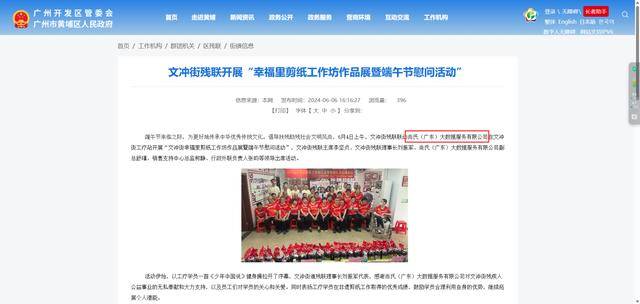 【2024年6月·广州市黄埔区文冲街道】区政府门户网《文冲街开展“幸福里驿站工休站作品展暨端午节慰问活动”》页面截图。来源:广州市黄埔区人民政府门户网站