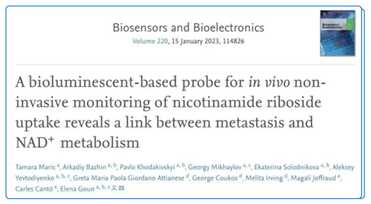 [2]Maric T, Bazhin A, Khodakivskyi P, Mikhaylov G, Solodnikova E, Yevtodiyenko A, Giordano Attianese GMP, Coukos G, Irving M, Joffraud M, Cantó C, Goun E. A bioluminescent-based probe for in vivo non-invasive monitoring of nicotinamide riboside uptake reveals a link between metastasis and NAD+ metabolism. Biosens Bioelectron. 2022 Oct 29;220:114826. doi: 10.1016/j.bios.2022.114826. Epub ahead of print. PMID: 36371959.