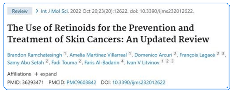 [3]Brandon Ramchatesingh ,Amelia Martinez Villarreal,Domenico Arcuri ,Francois Lagace, Samy Abu Setah ,Fadi Touma ,Faris Al-Badarin,Ivan V Litvinov.The Use of Retinoids for the Prevention and Treatment of Skin Cancers: An Updated Review.Int J Mol Sci.2022 Oct20;23(20):12622. doi:10.3390/ijms232012622.
