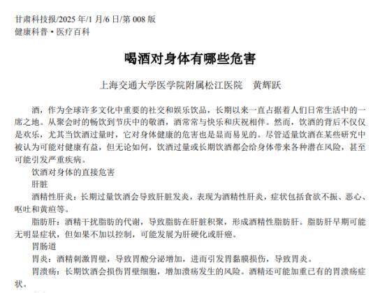 [1]喝酒对身体有哪些危害 黄辉跃 甘肃科技报2025-01-06