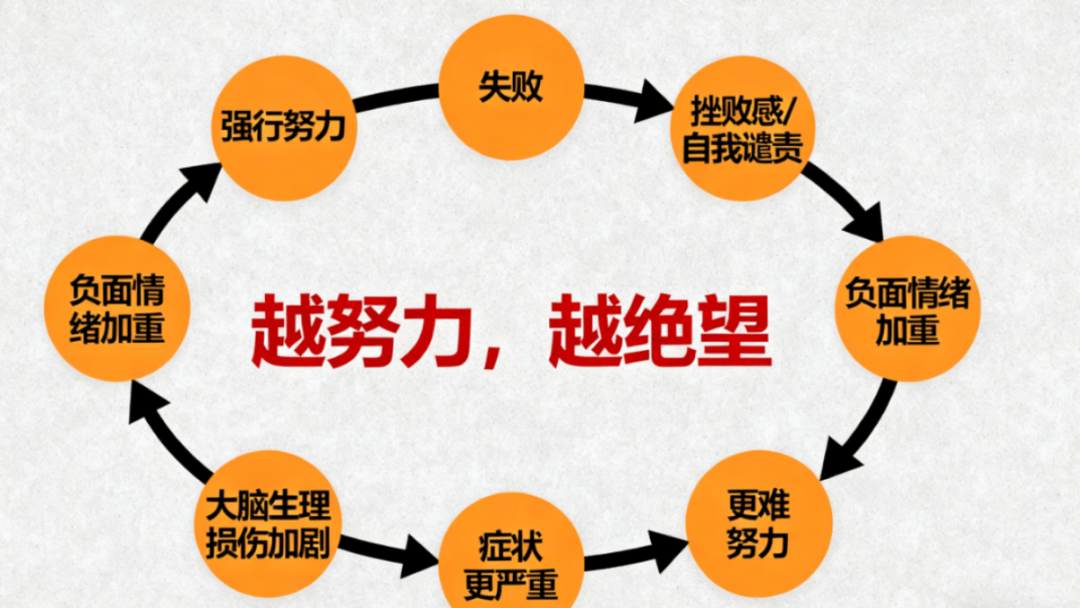 当患者因此陷入自我怀疑和自责的情绪中时,负面情绪会进一步抑制神经递质的分泌,加重脑区功能损伤,形成“发现症状→自我否定→持续恶化”的恶性循环。