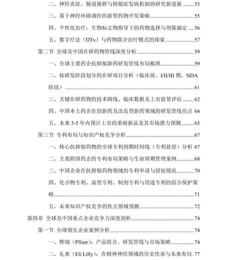 同时全球抗抑郁药物研发正迎来三十年未遇的“创新拐点”。传统的单胺类神经递质理论正在被突破从 NMDA 受体拮抗剂到神经可塑性调节,从炎症免疫机制到肠道微生物-脑轴研究,新一代药物正在从根本上改写“抑郁症如何被治疗”的科学认知。以强生旗下艾氯胺酮鼻喷雾剂为代表的首个快速抗抑郁药物,仅用24 小时即可显著改善症状,打破了传统药物 4-6 周起效的桎梏。全球研发管线中,超过80个创新分子已进入临床阶段,预计 2025-2030年间将有12-18 款重磅新药上市,为全球市场注入强劲动力。