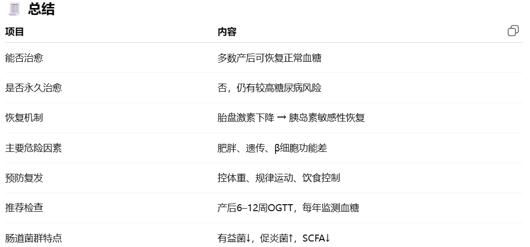 约 80%–90% 的女性在分娩后血糖可恢复正常,因为胎盘激素水平下降,胰岛素抵抗消失。