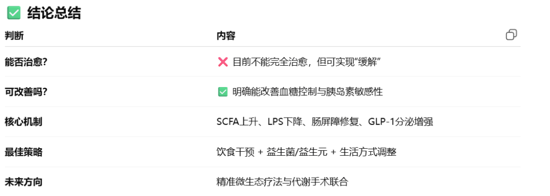 食与心温馨总结:目前虽然尚无医学手段能完全治愈糖尿病,但能实现临床治愈,即患者在一段时间内不需要药也能维持正常血糖。这在胃旁路手术后(手术后菌群也会改变)或者成功的菌群调整后都能实现。