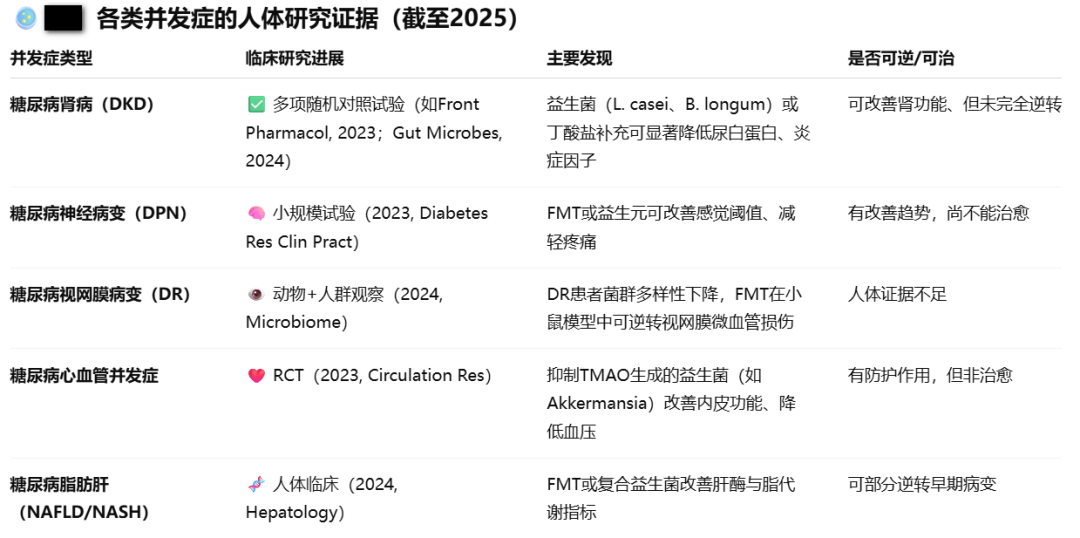 已有证据确认益生菌干预能改善并发症严重程度,尤其在糖尿病肾病、脂肪肝、心血管并发症早期,显示出明确治疗潜力,但未能完全逆转并发症造成的损害。