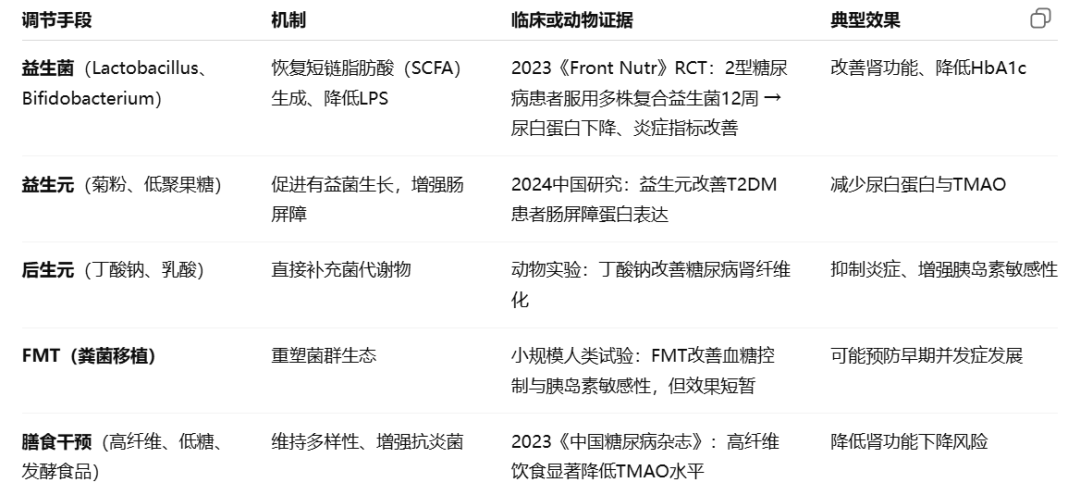 目前菌群治疗研究最成熟的并发症是糖尿病肾病。研究发现,补充丁酸盐或复合益生菌可