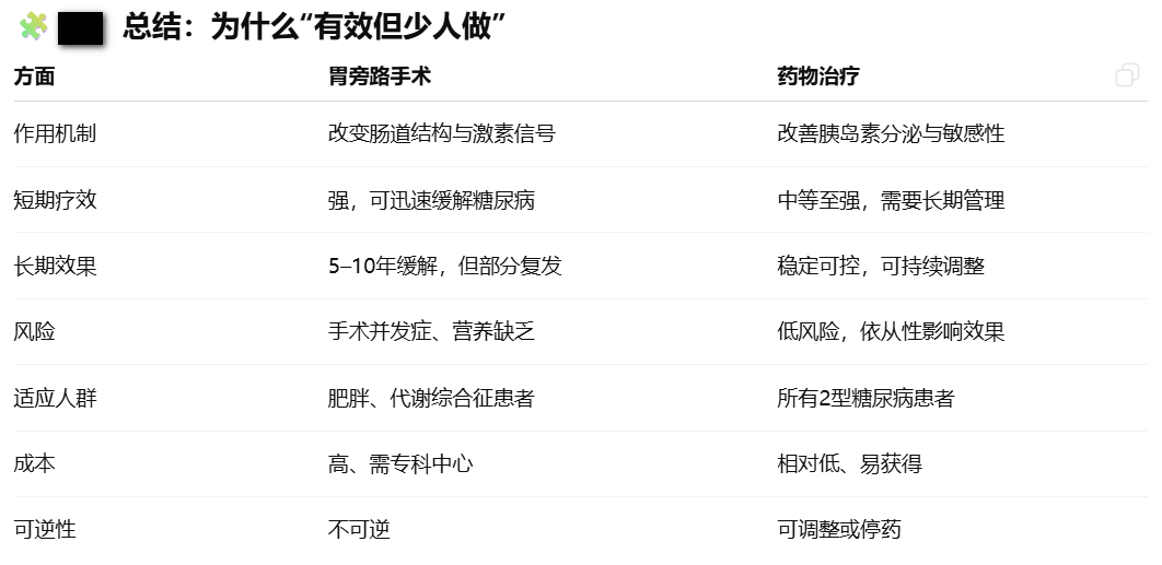 不过根据国际指南(如ADA、EASD、中华医学会2023版):手术仅适用于 BMI≥32.5(亚洲人)或≥35(西方人) 且药物治疗无效的2型糖尿病患者。而中国糖尿病患者中约70%体重正常或仅稍胖,不适合手术。