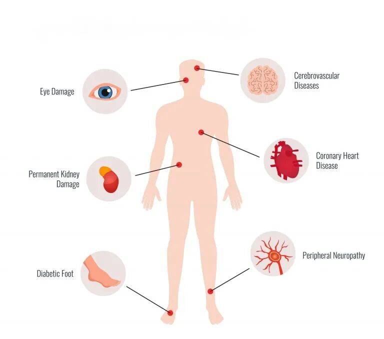 对于糖尿病患者,血糖高本身可以通过药物来控制,但是长期高血糖对于其他身体器官(比如眼睛、肾脏、足和心血管等)的损害才更可怕,这就是糖尿病并发症。