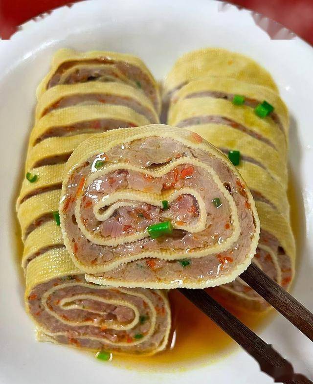 5、豆皮肉卷蒸熟后,改刀切成厚厚的薄片(不要切的太薄了,要不然吃着不爽),切好摆个富贵花开的造型,配上调好的灵魂蘸料就可以开吃了。